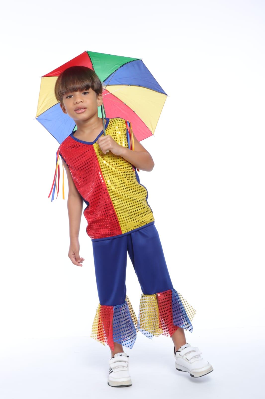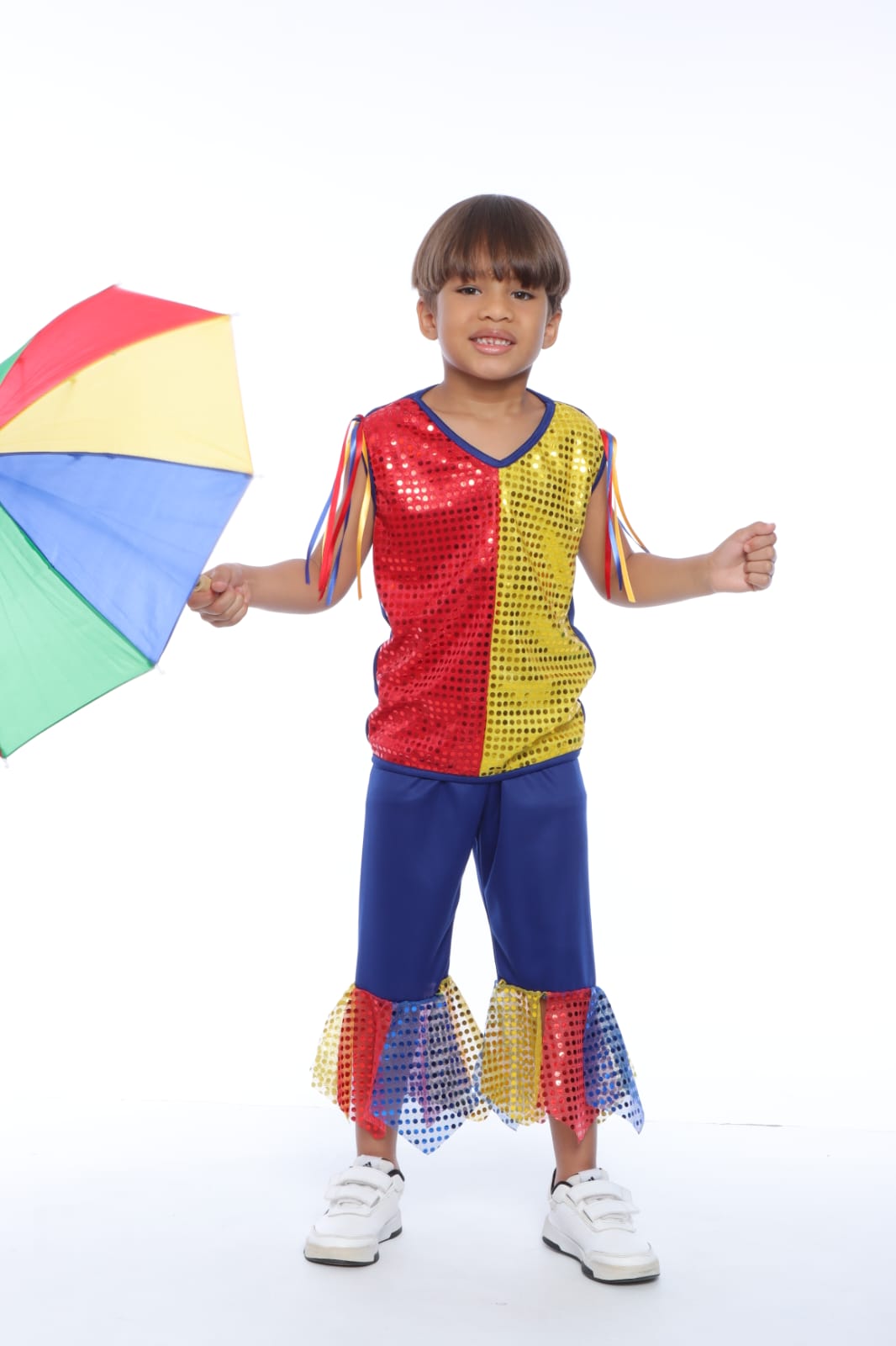O conjuntinho é puro charme e destaque. A camisa regata traz um contraste vibrante de vermelho e amarelo, toda trabalhada em paetês brilhantes, com detalhes de fitas coloridas nos ombros. A bermuda azul é super confortável para garantir total liberdade na hora da dança, e conta com lindos babados em paetês na barra que acompanham cada passo do seu passista!