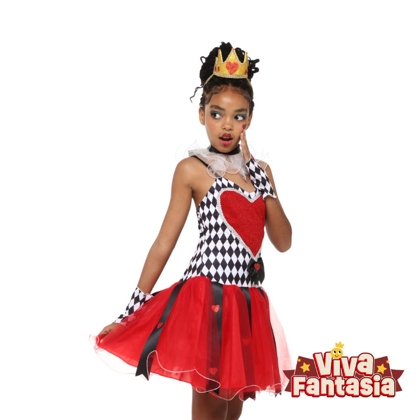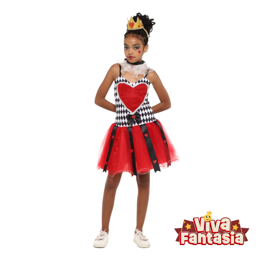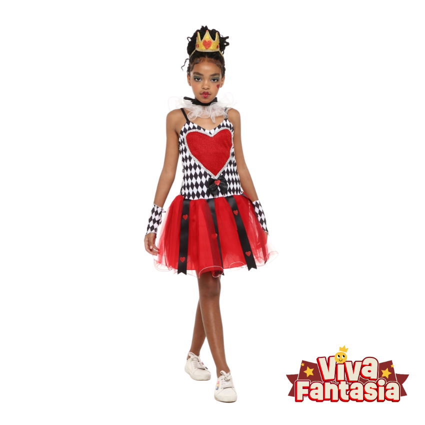 O vestido é super rico em detalhes, destacando-se pelo busto com estampa xadrez em preto e branco e um lindo coração vermelho texturizado centralizado. A saia rodada em tule vermelho, com fitas pretas de cetim pendentes, traz um movimento incrível para a peça. Para completar o visual majestoso, a fantasia acompanha punhos xadrez e uma gola em tule super delicada!