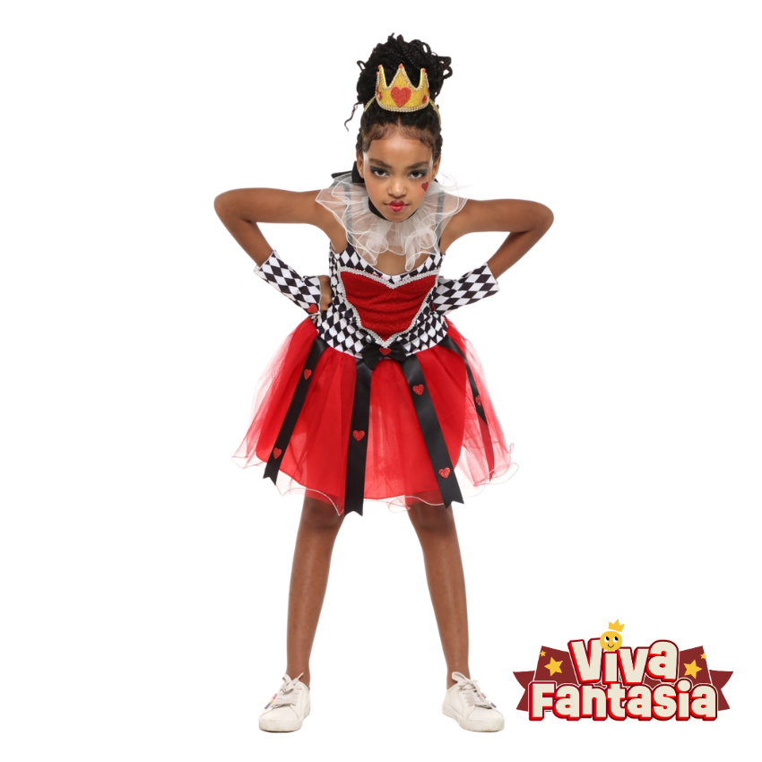 Cortem as cabeças… mas com muito estilo e fofura! A Fantasia de Rainha de Copas é a escolha perfeita para as meninas que querem um visual cheio de personalidade, charme e magia, inspirada no clássico conto de fadas. É o look ideal para aniversários temáticos, festas escolares, bloquinhos infantis ou para brincar muito!